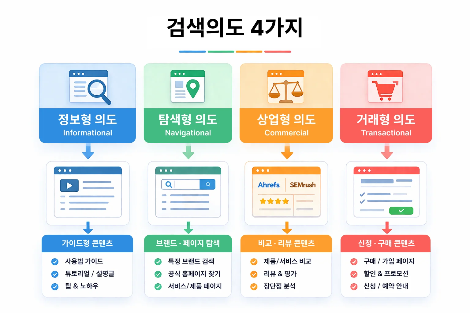 유형 | 검색 의도 | 예시 키워드 | 맞는 콘텐츠 형태 | 구글 SERP 신호 |