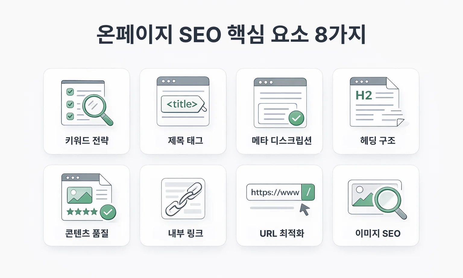 핵심 요소는 키워드 전략, 제목 태그, 메타 디스크립션, 헤딩 구조, 콘텐츠 품질, 내부 링크, URL 최적화, 이미지 SEO 8가지입니다.