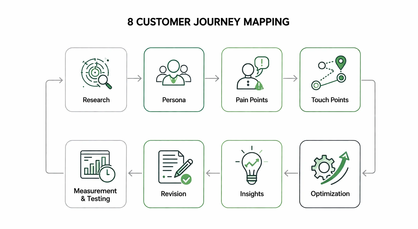 고객 여정 지도는 조사→페르소나→문제점→접점→최적화→인사이트→수정→측정/테스트의 8단계로 설계됩니다.